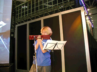 僕の場合は、WWCFの最初のテーマで自信満々にラッパを吹き終えたつもりが、まだ途中でその後数小節間バックのオケだけが空しく鳴ってたり(途中で気付いたのですが、慌ててないふりをするのに苦労した・・)、師匠といえば、曲間での思わぬ(打ち合わせと違った)MC挿入事件、光吉さんの「思いっきりのいい」曲順間違え等(この時はピアニカを持ってすでに待ち構えていたので、ラッパに持ち替える時間が無く超あわてました・・)、多彩な内容でした(笑)